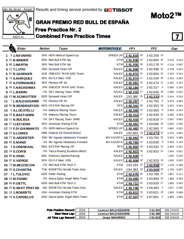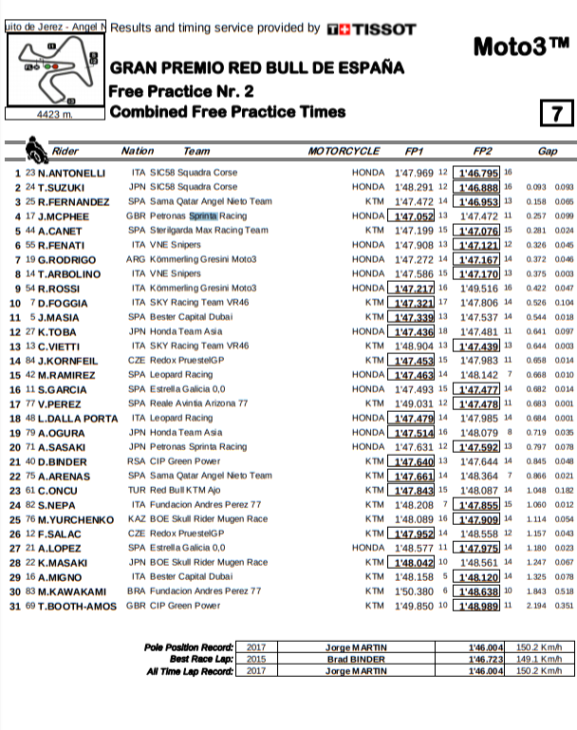 Morning leader John McPhee (Petronas Honda) was one of a handful not to improve his FP1 time, but it was good enough to keep him fourth, ahead of Aron Canet (Sterilgarda KTM) and Romano Fenati (Snipers Honda); with the Hondas of Gabriel Rodrigo, Tony Arbolino and Riccardo Rossi; with Dennis Foggia’s KTM rounding