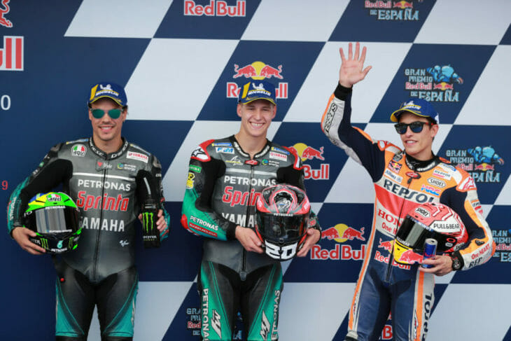 Top of the times went to Frenchman Fabio Quartararo, in only his fourth outing on the Petronas M1 Yamaha – last year’s bike, for the most junior of four Yamaha riders. Aged 18, if only for the next 15 days, Quartararo took the “youngest-ever” pole record from Marquez, who was quick to congratulate him on the feat.