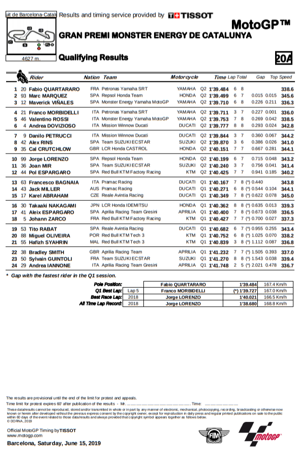 The decision by the panel of stewards promotes Franco Morbidelli (Petronas Yamaha) to his second front-row start of the season, and puts Vinales at the far end of the second row, now led by his Monster Yamaha team-mate Valentino Rossi, from factory Ducati rider Andrea Dovizioso.