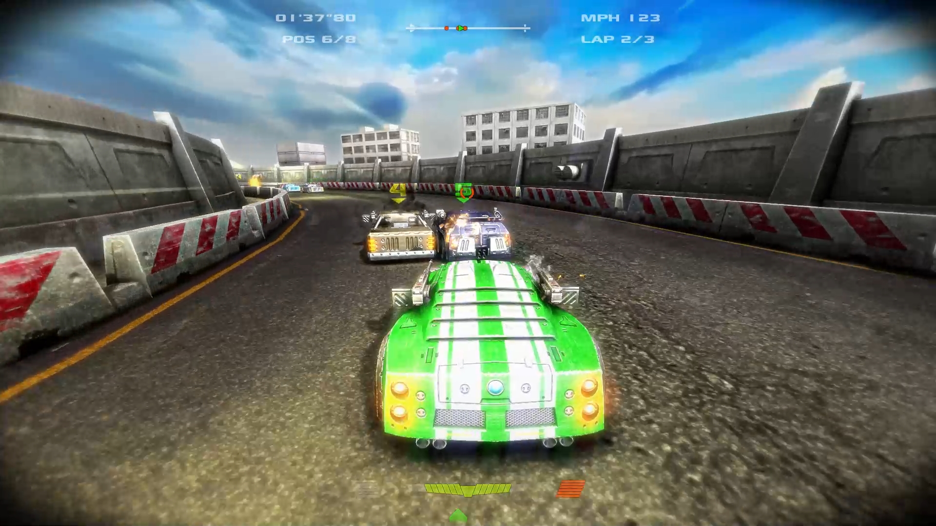 一般的なレースゲームにおいて目標となるのは、まず何よりも1位でゴールインすること。本作もその例に漏れず、対向車を出し抜いてトップを目指すことを求められます。ただし1つ違うのが、"武器を使って対戦相手をリタイアさせても良い"という点。邪魔な車に体当たりをブチかますのはもちろんのこと、目の上のタンコブとなる障害物はどんどん破壊しましょう。