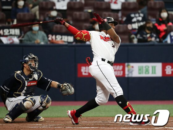 | 10일 오후 서울 구로구 고척스카이돔에서 열린 '2020 신한은행 SOL KBO 포스트시즌‘ 플레이오프 2차전 두산베어스와 kt위즈의 경기에서 kt 로하스가 3회말 2사 솔로홈런을 치고 있다. 2020.11.10/뉴스1 © News1 김진환 기자 |